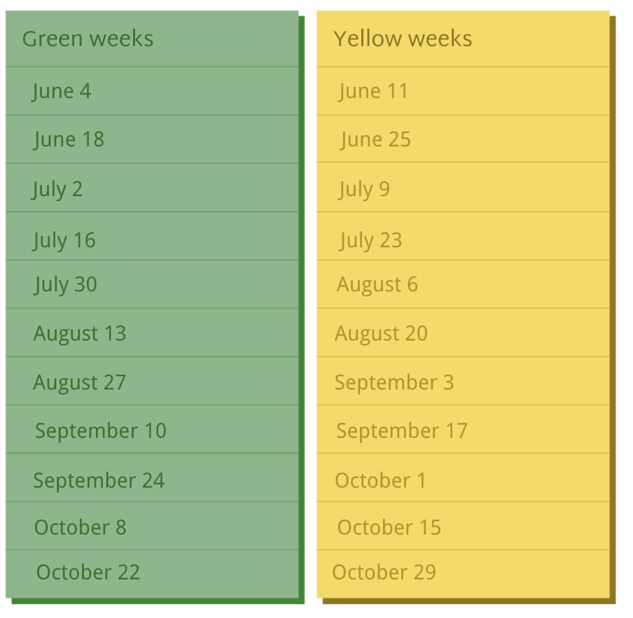 Half-share members are given a bi-weekly pickup schedule, and you will pick up on either “Green Weeks” or “Yellow Weeks”.